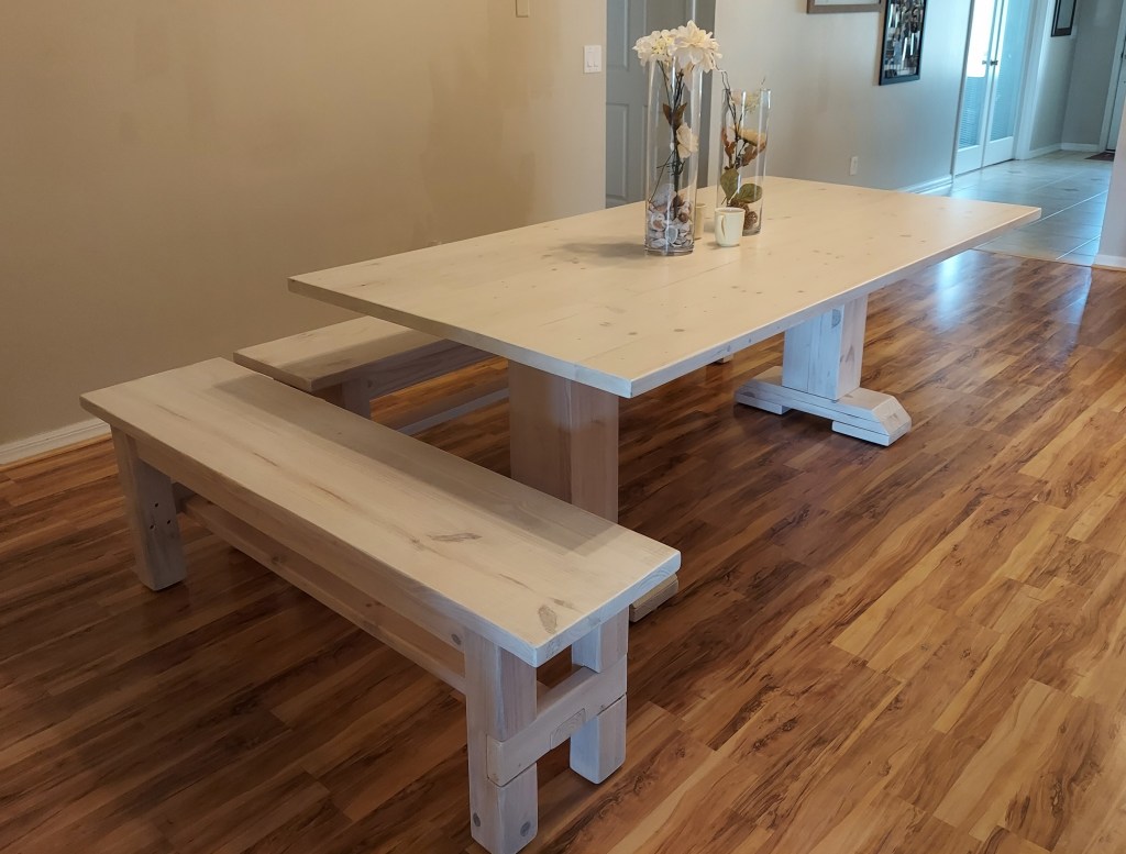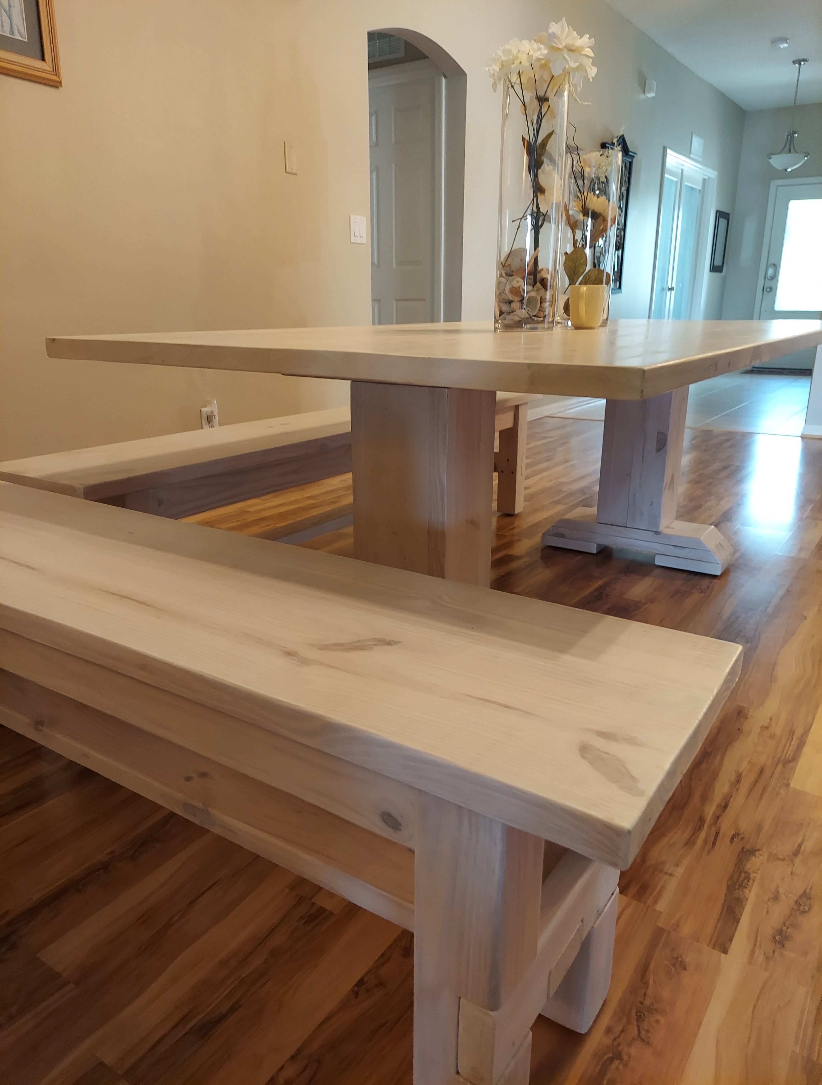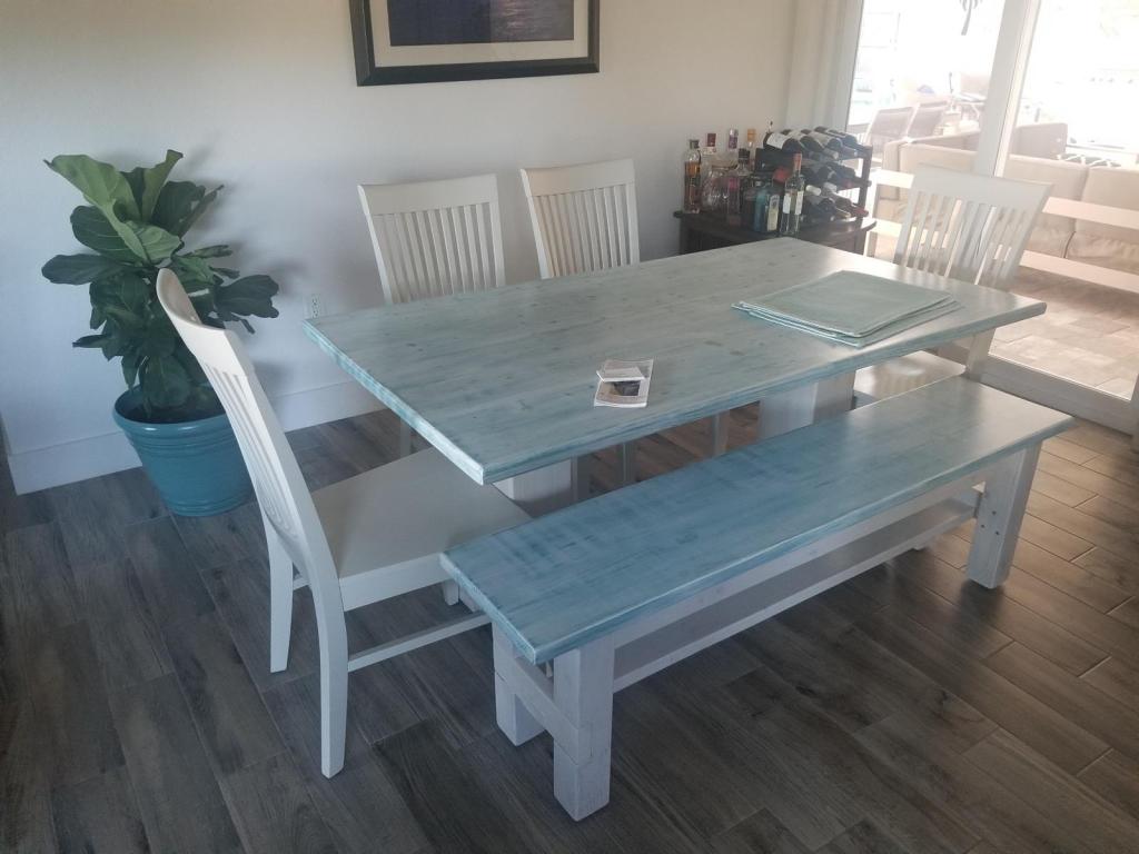 This stunning Simply White & Aqua stained Farmhouse Table sets the room off with an exquisite look at a local Beach House in Florida