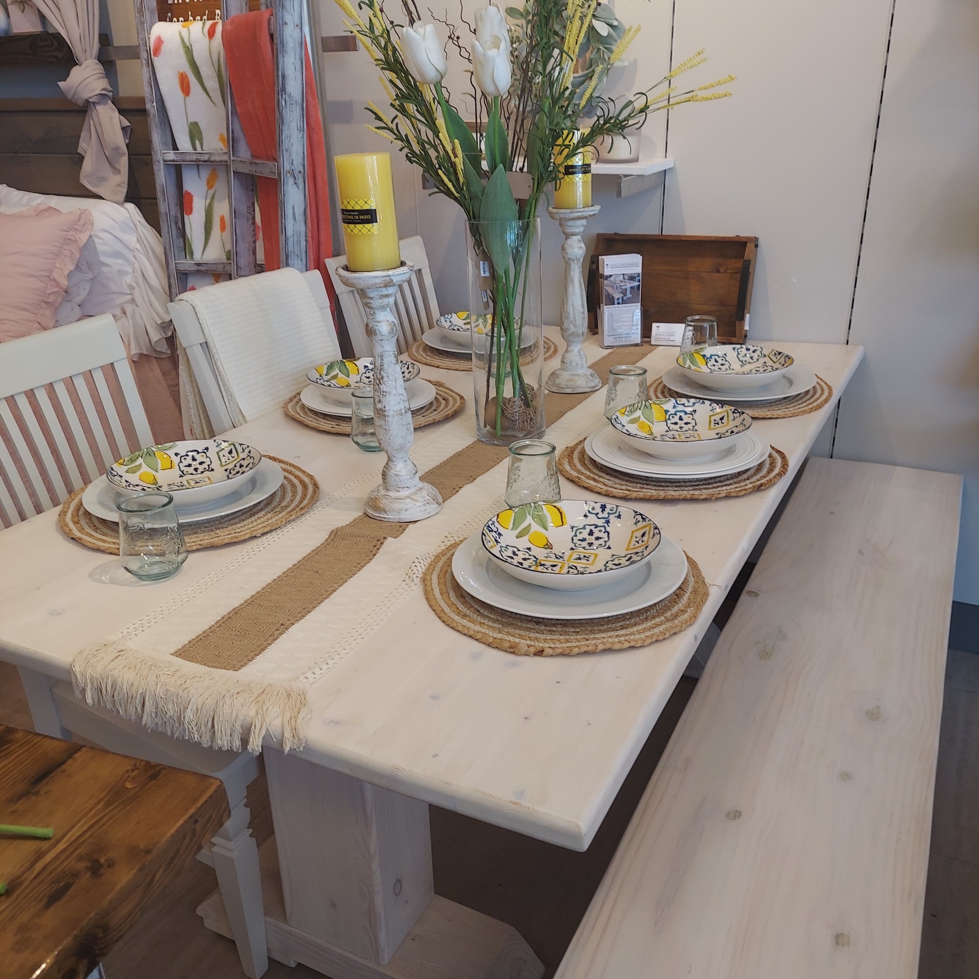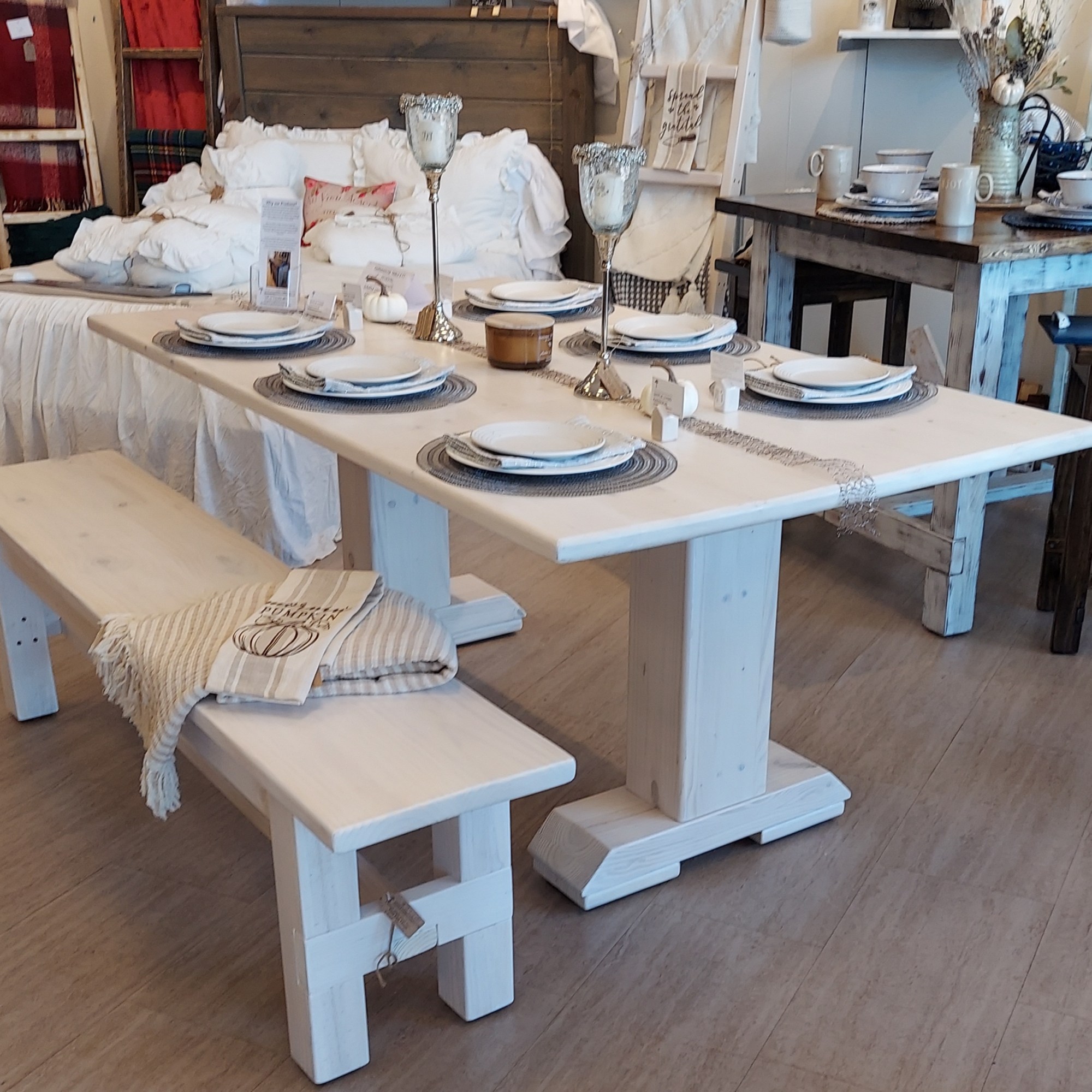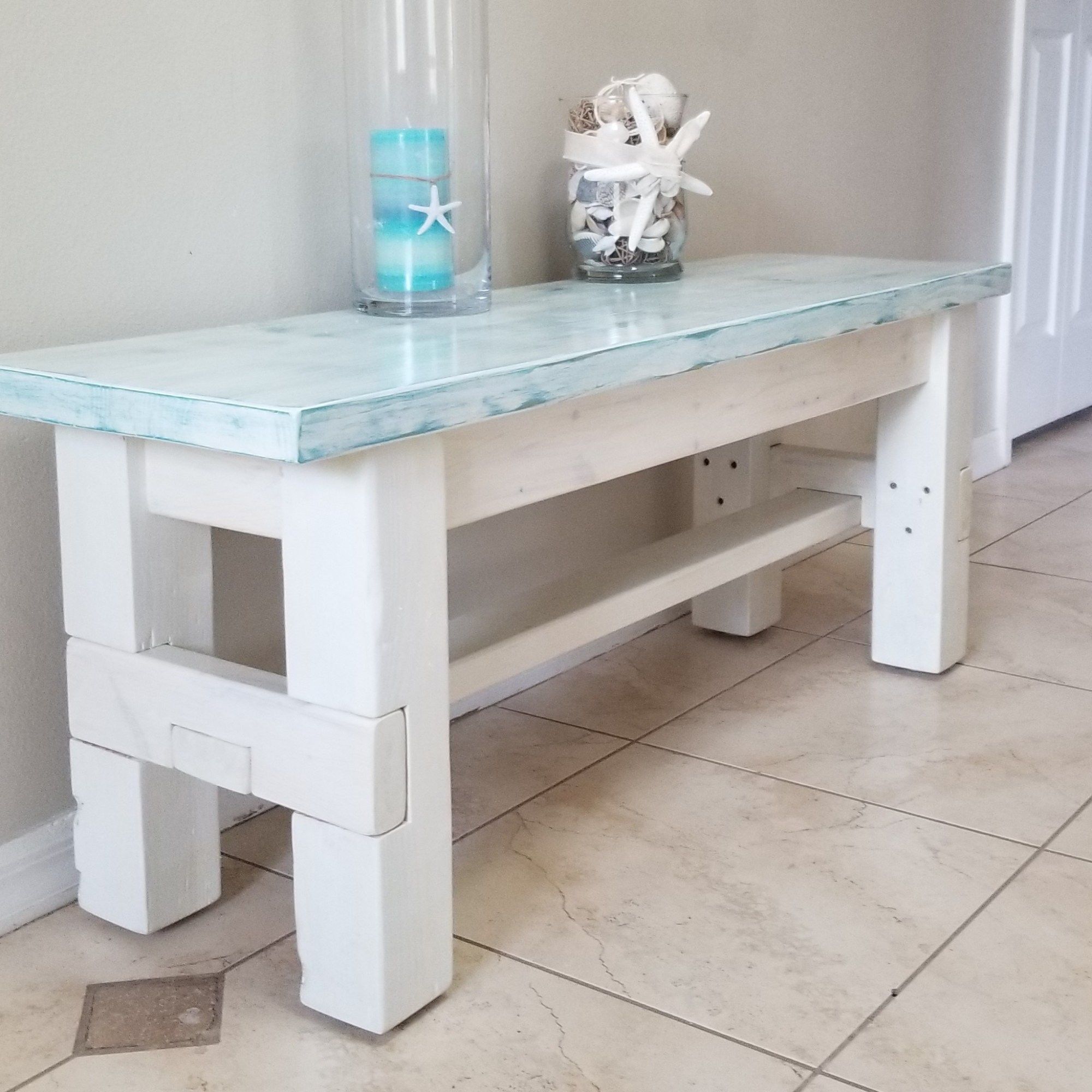 From Coastal Farmhouse to Traditional Farmhouse we have it all. Choose your stain to compliment any room. You can stain the bench in color of your choice, whitewash, distress or create a two toned look. These benches are 100% solid wood, handmade, designed and definitely one of a kind. They are not only comfortable, but sturdy enough to be able to withstand years of wear and tear and heavier weights. Whether your Farmhouse bench welcomes guests in your entryway, is an addition to your table or at the end of your bed, it is a guaranteed beautiful piece of furniture. Message us with ideas of colors and we will help you get things started. Begin making memories! Bench width is 14.5″, or order it with your own custom dimensions.